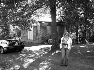 | Recreating a movie still... Jenette stands in for Barbara and the DeLorean stands in for the original GTO. |